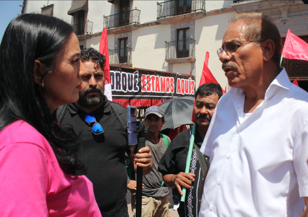 Una manifestación de cerca de 100 personas rodeo la puerta de la casa de la corregidora y lanzando varios reclamos con gritos y agitando banderines, logró atraer la atención de medios de comunicación que cubríamos las ruedas de prensa en Plaza de Armas, incluso la candidata de Querétaro Seguro, Paloma Arce se acercó a platicar con el líder de los manifestantes.
