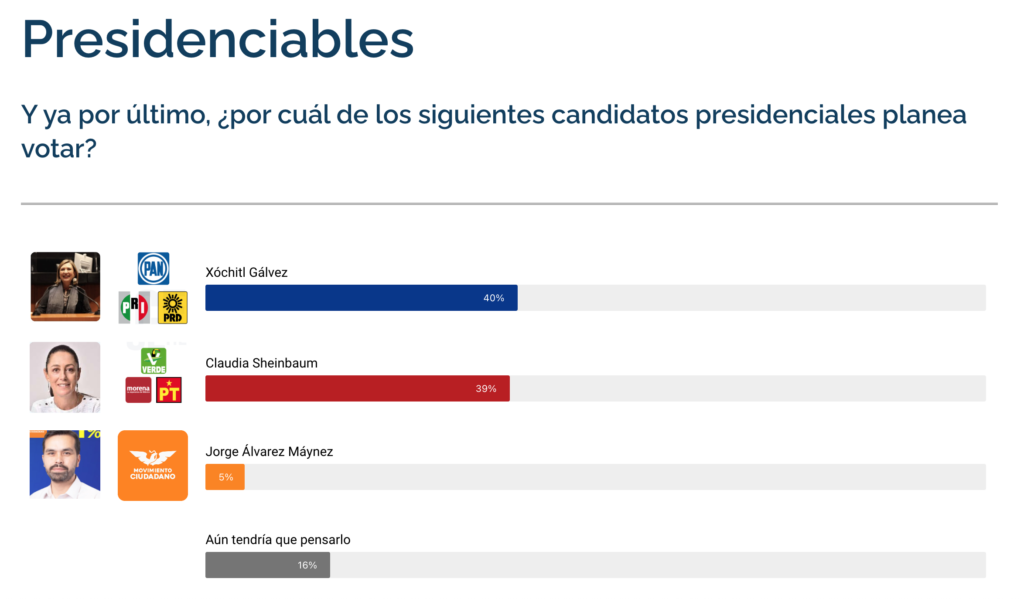También es de llamar la atención que C&E Research en otra encuesta tenga en empate técnico a las candidatas a al presidencia Xohitl Galvez y Claudia Sheinbaum pero que en prácticamente todas las encuestas a nivel nacional La candidata de MORENA aventaje hasta por 30 puntos, con lo cual se tendría muchas dudas al respecto de la metodología que usa esta encuestadora.